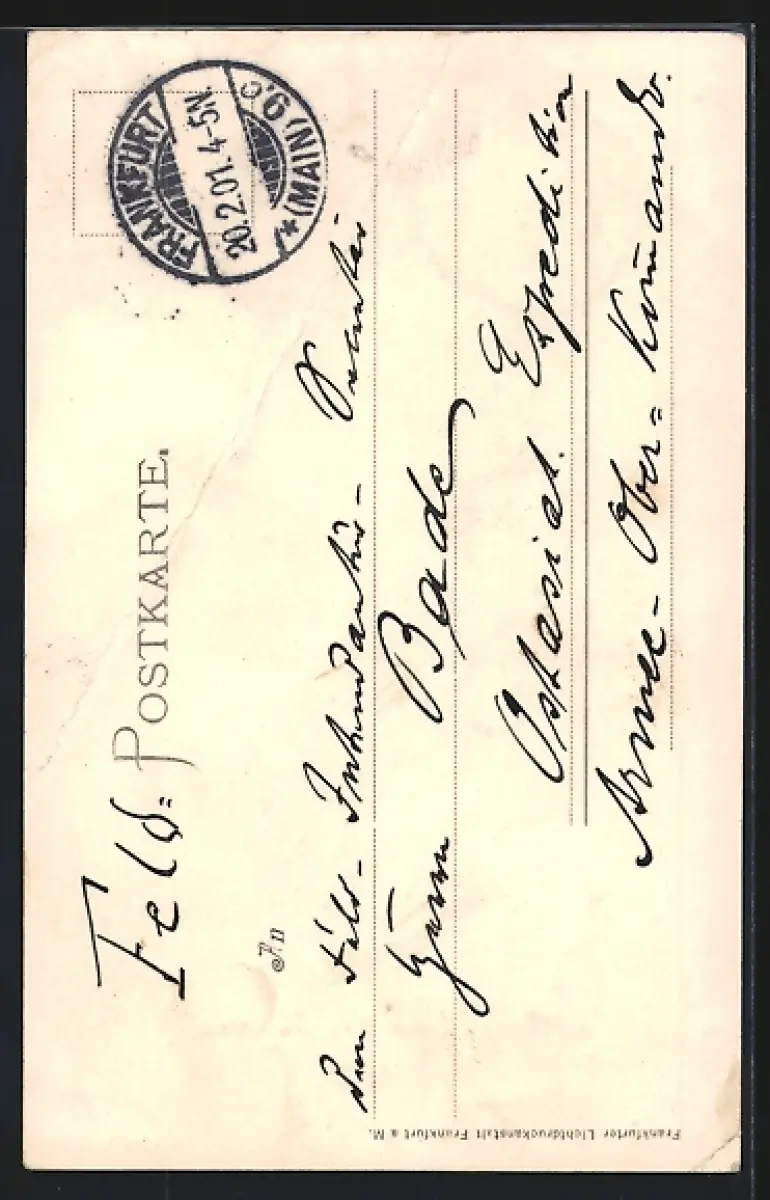 Personenbezogene Daten auf der Rückseite der Karte wurden durch blauen Textmarker unkenntlich gemacht. Die blauen Stellen sind auf die Vorderseite durchgeweicht und wirken sich negativ auf das Postkartenfoto aus