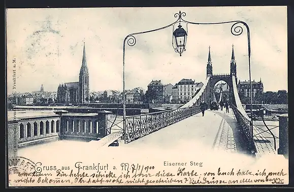 AK Alt-Frankfurt, Eiserner Steg mit Stadtpanorama