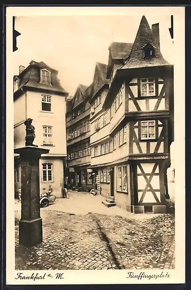 AK Alt-Frankfurt, Fünffingerplatz mit Geschäft und Statue