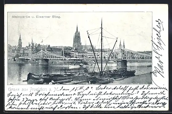 AK Alt-Frankfurt, Mainpartie und Eiserner Steg mit Kirche