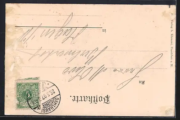 alte Ansichtskarte, gelaufen 1897, vorder- u. rückseitig Klebe- und Papierreste, guter Zustand