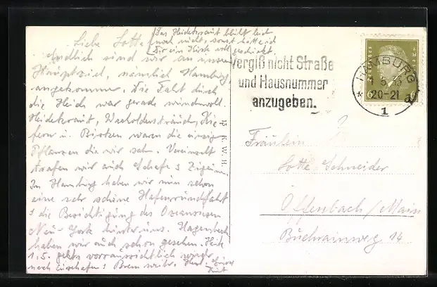 Personenbezogene Daten auf der Rückseite der Karte wurden durch blauen Textmarker unkenntlich gemacht. Die blauen Stellen sind auf die Vorderseite durchgeweicht und wirken sich negativ auf das Postkartenfoto aus
