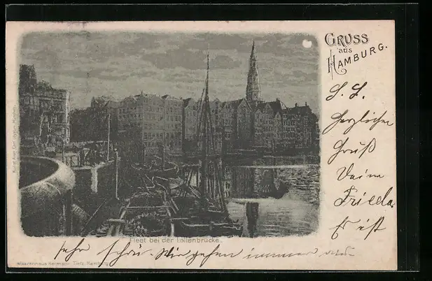 AK Alt-Hamburg, Fleet bei der Lollenbrücke bei Mondschein