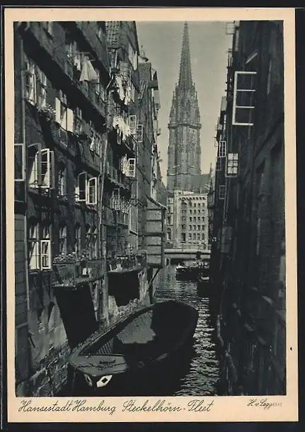 AK Alt-Hamburg, Steckelhörn-Fleet mit Kirche und Boot