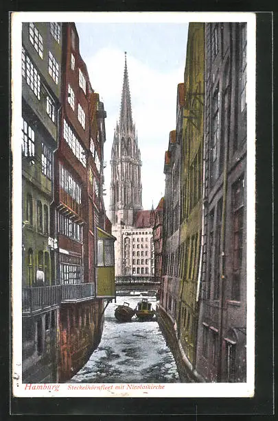 AK Alt-Hamburg, Steckelhörnfleet mit Nicolaikirche und Booten