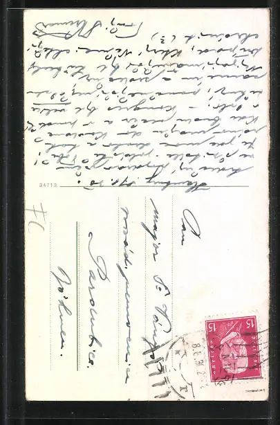 Personenbezogene Daten auf der Rückseite der Karte wurden durch blauen Textmarker unkenntlich gemacht. Die blauen Stellen sind auf die Vorderseite durchgeweicht und wirken sich negativ auf das Postkartenfoto aus