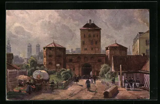 AK Alt-München, Isartor mit Soldaten und Marktstand