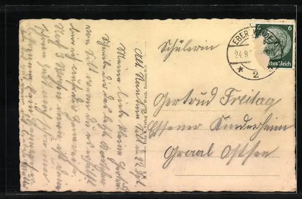 Personenbezogene Daten auf der Rückseite der Karte wurden durch blauen Textmarker unkenntlich gemacht. Die blauen Stellen sind auf die Vorderseite durchgeweicht und wirken sich negativ auf das Postkartenfoto aus