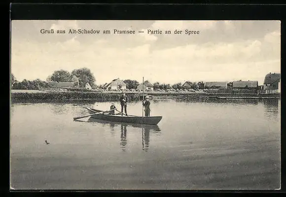 AK Alt-Schadow, Ruderboot auf der Spree mit Blick auf den Ort