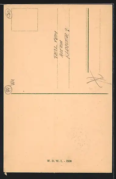 Personenbezogene Daten auf der Rückseite der Karte wurden durch blauen Textmarker unkenntlich gemacht. Die blauen Stellen sind auf die Vorderseite durchgeweicht und wirken sich negativ auf das Postkartenfoto aus