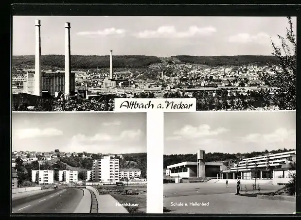 AK Altbach a. Neckar, Ortsansicht, Hochhäuser, Schule und Hallenbad