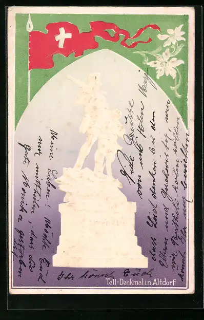 AK Altdorf, Tell-Denkmal mit Schweizer Fahne