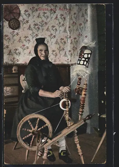 AK Alte Frau in hessischer Tracht am Spinnrad