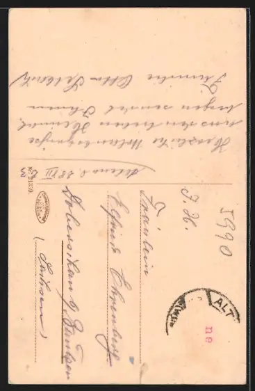 Personenbezogene Daten auf der Rückseite der Karte wurden durch blauen Textmarker unkenntlich gemacht. Die blauen Stellen sind auf die Vorderseite durchgeweicht und wirken sich negativ auf das Postkartenfoto aus