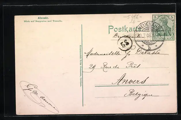 Personenbezogene Daten auf der Rückseite der Karte wurden durch blauen Textmarker unkenntlich gemacht. Die blauen Stellen sind auf die Vorderseite durchgeweicht und wirken sich negativ auf das Postkartenfoto aus