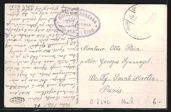 Personenbezogene Daten auf der Rückseite der Karte wurden durch blauen Textmarker unkenntlich gemacht. Die blauen Stellen sind auf die Vorderseite durchgeweicht und wirken sich negativ auf das Postkartenfoto aus