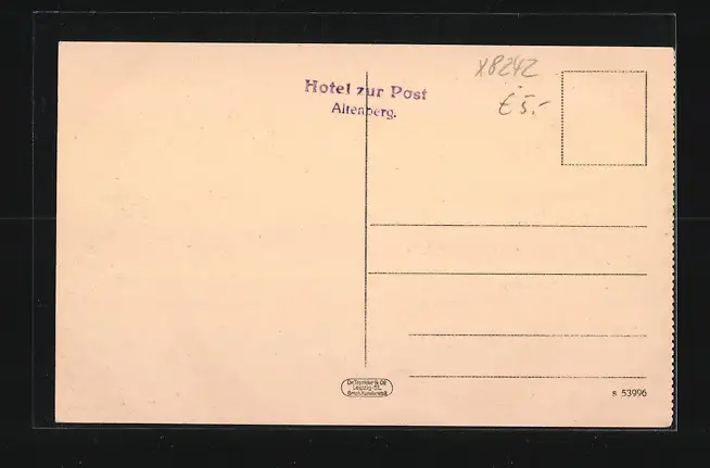 Personenbezogene Daten auf der Rückseite der Karte wurden durch blauen Textmarker unkenntlich gemacht. Die blauen Stellen sind auf die Vorderseite durchgeweicht und wirken sich negativ auf das Postkartenfoto aus