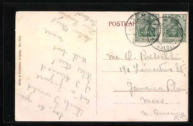 Personenbezogene Daten auf der Rückseite der Karte wurden durch blauen Textmarker unkenntlich gemacht. Die blauen Stellen sind auf die Vorderseite durchgeweicht und wirken sich negativ auf das Postkartenfoto aus