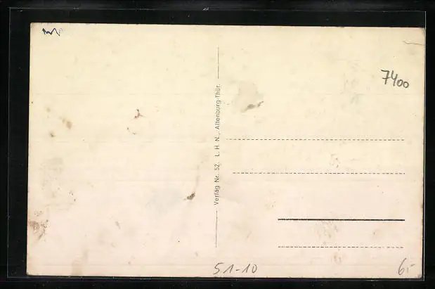 Personenbezogene Daten auf der Rückseite der Karte wurden durch blauen Textmarker unkenntlich gemacht. Die blauen Stellen sind auf die Vorderseite durchgeweicht und wirken sich negativ auf das Postkartenfoto aus