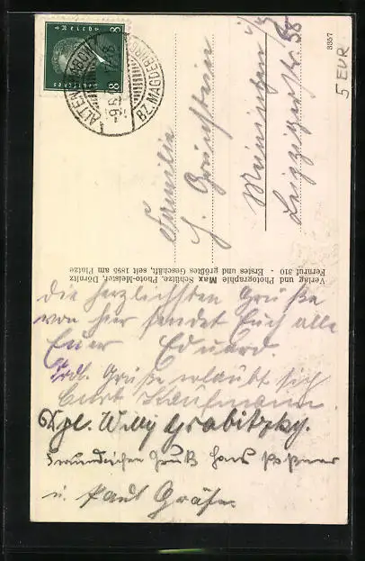 Personenbezogene Daten auf der Rückseite der Karte wurden durch blauen Textmarker unkenntlich gemacht. Die blauen Stellen sind auf die Vorderseite durchgeweicht und wirken sich negativ auf das Postkartenfoto aus