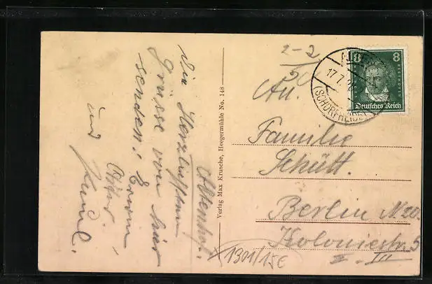 Personenbezogene Daten auf der Rückseite der Karte wurden durch blauen Textmarker unkenntlich gemacht. Die blauen Stellen sind auf die Vorderseite durchgeweicht und wirken sich negativ auf das Postkartenfoto aus