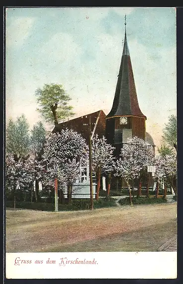 AK Altenlande / Kirschenlande, Kirche und blühende Obstbäume