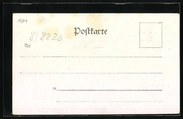 Personenbezogene Daten auf der Rückseite der Karte wurden durch blauen Textmarker unkenntlich gemacht. Die blauen Stellen sind auf die Vorderseite durchgeweicht und wirken sich negativ auf das Postkartenfoto aus