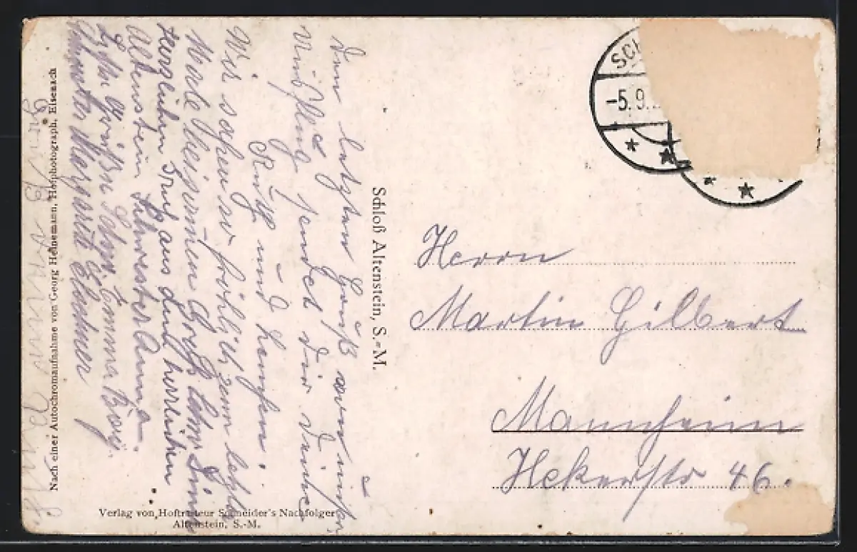 Personenbezogene Daten auf der Rückseite der Karte wurden durch blauen Textmarker unkenntlich gemacht. Die blauen Stellen sind auf die Vorderseite durchgeweicht und wirken sich negativ auf das Postkartenfoto aus