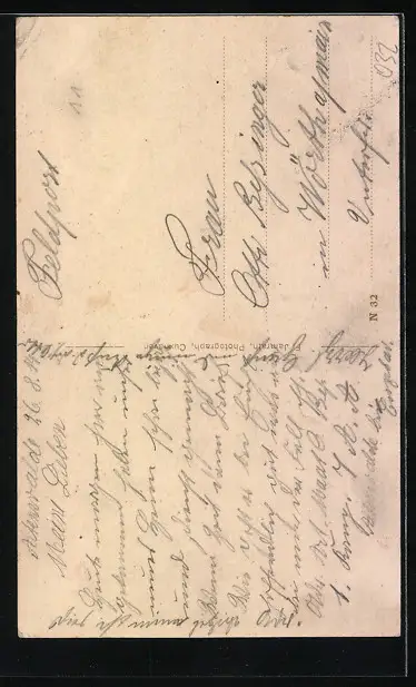 Personenbezogene Daten auf der Rückseite der Karte wurden durch blauen Textmarker unkenntlich gemacht. Die blauen Stellen sind auf die Vorderseite durchgeweicht und wirken sich negativ auf das Postkartenfoto aus