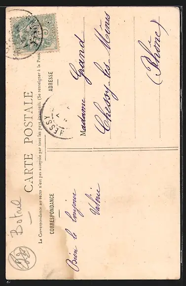 Personenbezogene Daten auf der Rückseite der Karte wurden durch blauen Textmarker unkenntlich gemacht. Die blauen Stellen sind auf die Vorderseite durchgeweicht und wirken sich negativ auf das Postkartenfoto aus