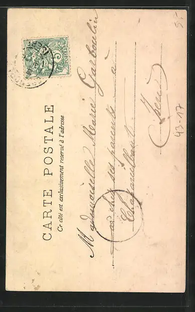 Personenbezogene Daten auf der Rückseite der Karte wurden durch blauen Textmarker unkenntlich gemacht. Die blauen Stellen sind auf die Vorderseite durchgeweicht und wirken sich negativ auf das Postkartenfoto aus