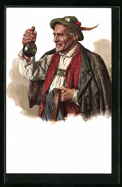 AK Alter Mann in Tracht betrachtet Weinflasche