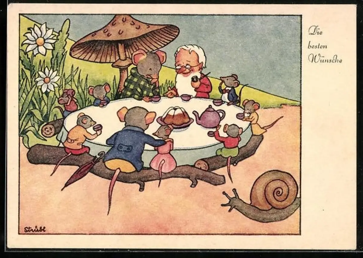 AK Alter Zwerg und Mäusefamilie bei einem Teekränzchen
