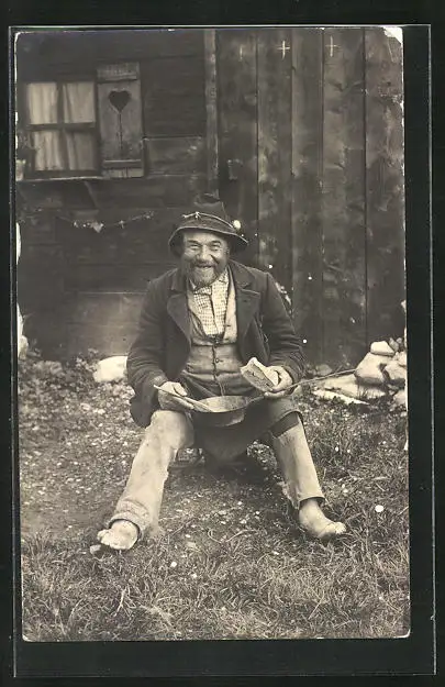 AK Alter lachender Mann beim Mittagessen vor der Hütte