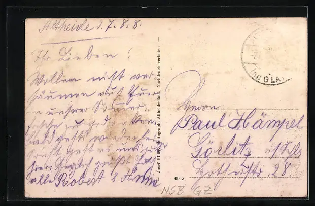 Personenbezogene Daten auf der Rückseite der Karte wurden durch blauen Textmarker unkenntlich gemacht. Die blauen Stellen sind auf die Vorderseite durchgeweicht und wirken sich negativ auf das Postkartenfoto aus
