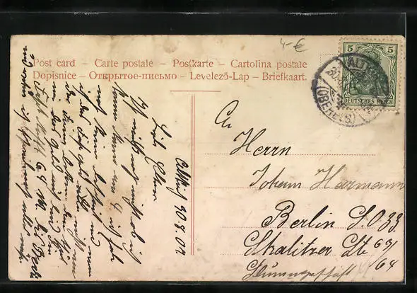 gelaufen 1907, Eckknick li. unten, Abriebspur, guter Zustand