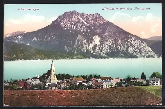 AK Altmünster, Ortsansicht mit dem Traunstein