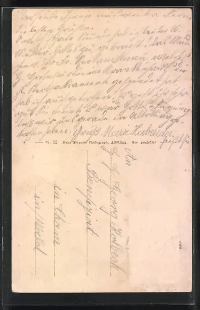Personenbezogene Daten auf der Rückseite der Karte wurden durch blauen Textmarker unkenntlich gemacht. Die blauen Stellen sind auf die Vorderseite durchgeweicht und wirken sich negativ auf das Postkartenfoto aus