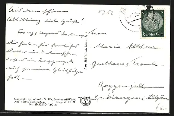 Personenbezogene Daten auf der Rückseite der Karte wurden durch blauen Textmarker unkenntlich gemacht. Die blauen Stellen sind auf die Vorderseite durchgeweicht und wirken sich negativ auf das Postkartenfoto aus