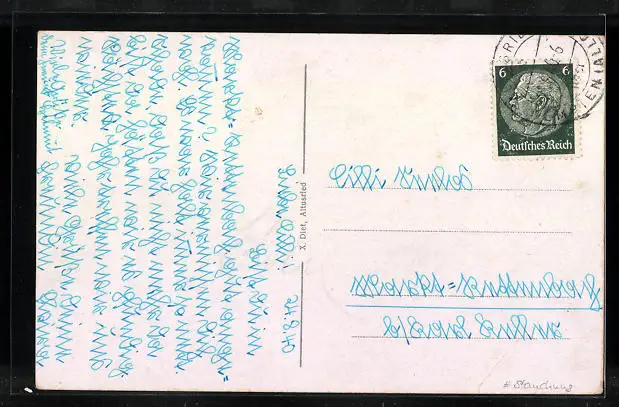 Personenbezogene Daten auf der Rückseite der Karte wurden durch blauen Textmarker unkenntlich gemacht. Die blauen Stellen sind auf die Vorderseite durchgeweicht und wirken sich negativ auf das Postkartenfoto aus