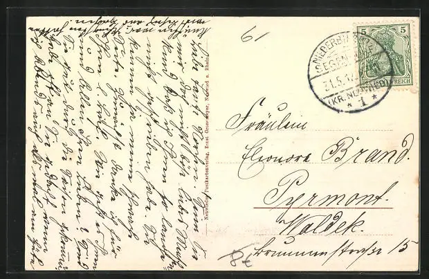 Personenbezogene Daten auf der Rückseite der Karte wurden durch blauen Textmarker unkenntlich gemacht. Die blauen Stellen sind auf die Vorderseite durchgeweicht und wirken sich negativ auf das Postkartenfoto aus