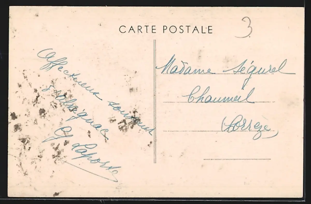 Personenbezogene Daten auf der Rückseite der Karte wurden durch blauen Textmarker unkenntlich gemacht. Die blauen Stellen sind auf die Vorderseite durchgeweicht und wirken sich negativ auf das Postkartenfoto aus