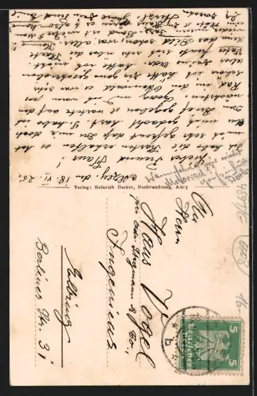 Personenbezogene Daten auf der Rückseite der Karte wurden durch blauen Textmarker unkenntlich gemacht. Die blauen Stellen sind auf die Vorderseite durchgeweicht und wirken sich negativ auf das Postkartenfoto aus