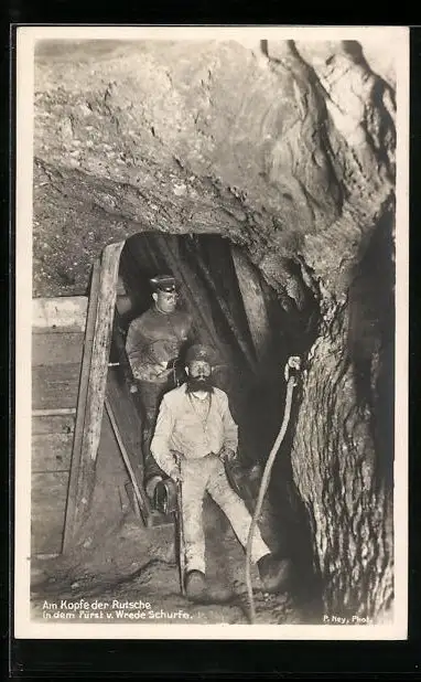 AK Am Kopf der Rutsche in dem Fürst v. Wrede Schurfe, Bergleute
