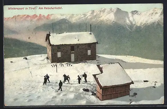 AK Am Patscherkofel, Berghütte mit Skiläufern