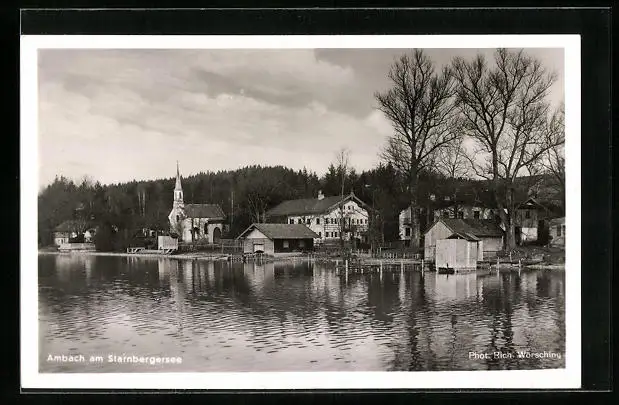AK Ambach am Starnbergersee, Ortspartie mit Gasthaus und Kirche, See
