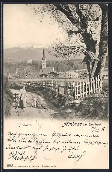 AK Ambras bei Innsbruck, Ortsansicht, im Hintergrund das Schloss