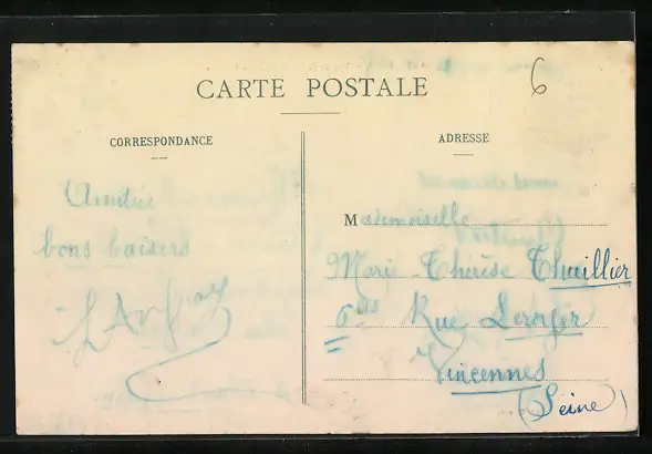Personenbezogene Daten auf der Rückseite der Karte wurden durch blauen Textmarker unkenntlich gemacht. Die blauen Stellen sind auf die Vorderseite durchgeweicht und wirken sich negativ auf das Postkartenfoto aus