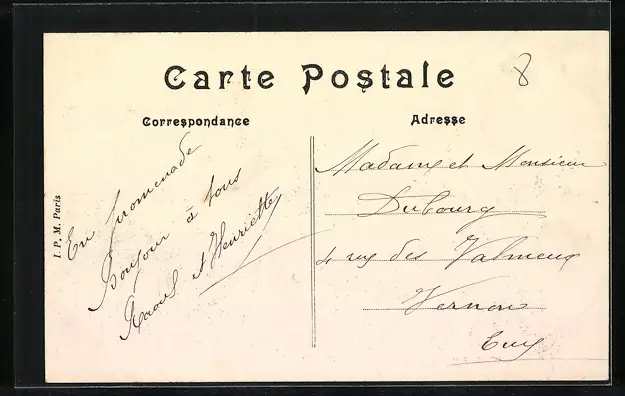 Personenbezogene Daten auf der Rückseite der Karte wurden durch blauen Textmarker unkenntlich gemacht. Die blauen Stellen sind auf die Vorderseite durchgeweicht und wirken sich negativ auf das Postkartenfoto aus