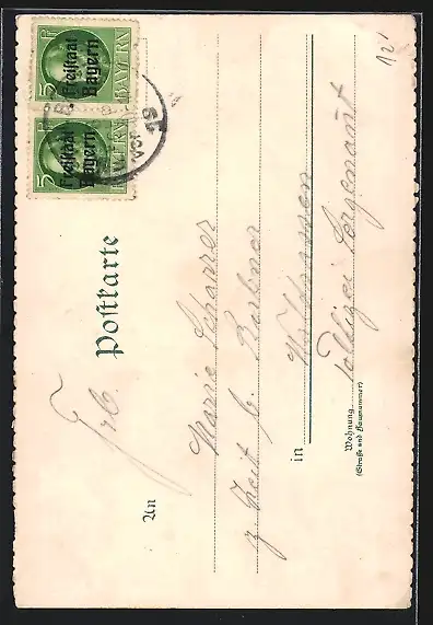 Personenbezogene Daten auf der Rückseite der Karte wurden durch blauen Textmarker unkenntlich gemacht. Die blauen Stellen sind auf die Vorderseite durchgeweicht und wirken sich negativ auf das Postkartenfoto aus